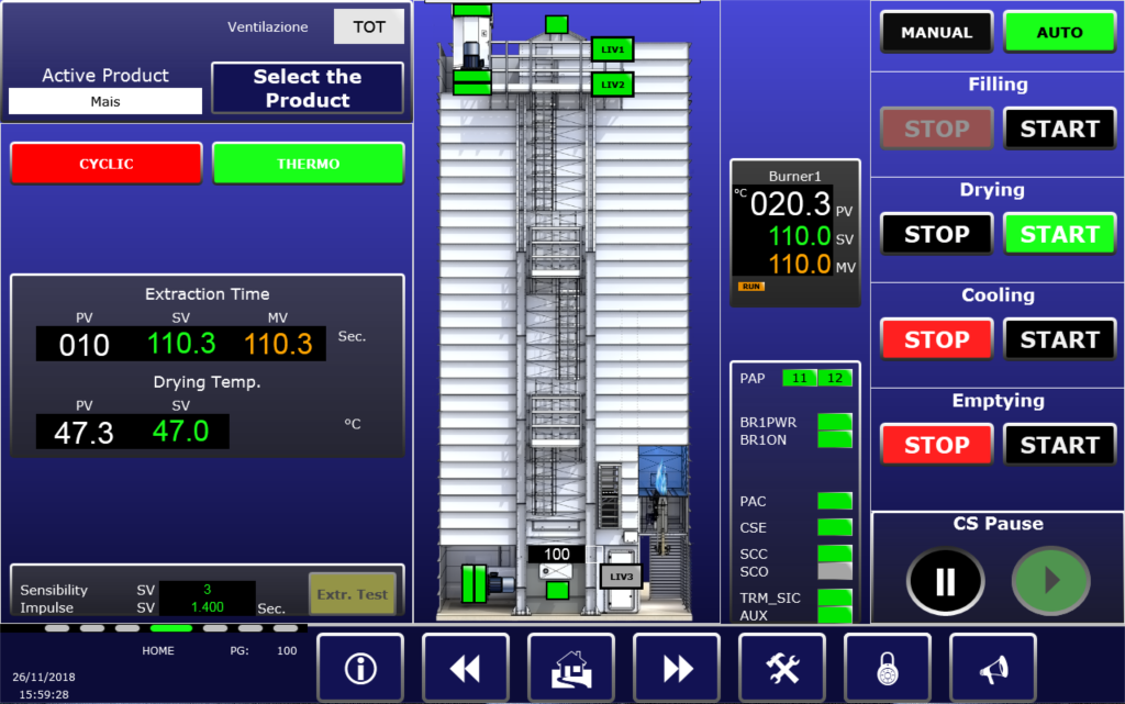 Датчики температуры расположены по всей шахте зерносушилки. Контроль температуры зерна в каждой точке